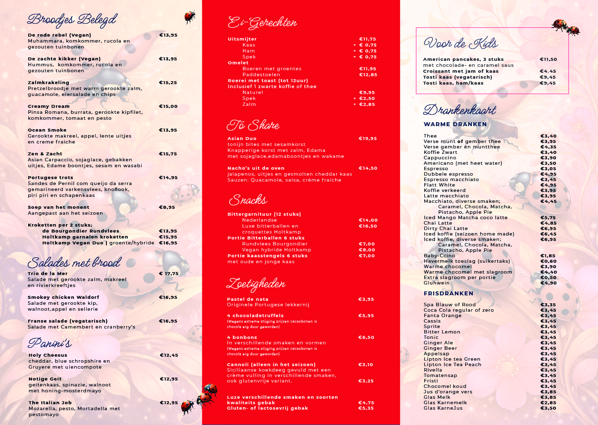 U kunt bij ons terecht voor: Koffie/thee gebak, Ontbijt, Lunch, Brunch (met reservering), High-tea (met reservering minimaal 24 uur van te voren), Receptie bruiloft (met reservering), Verjaardag (met reservering), Babyshower (met reservering), Bedrijfslunch (met reservering), Bedrijfsborrel (met reservering), Condoleance (met reservering).